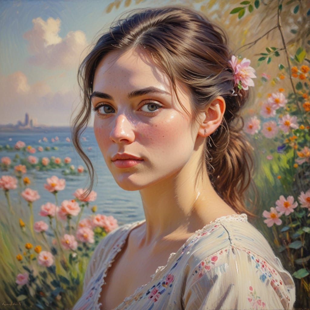 A close-up portrait of a woman in soft focus. The artwork employs a gentle color palette and delicate details, reminiscent of impressionist oil paintings with warm lighting.