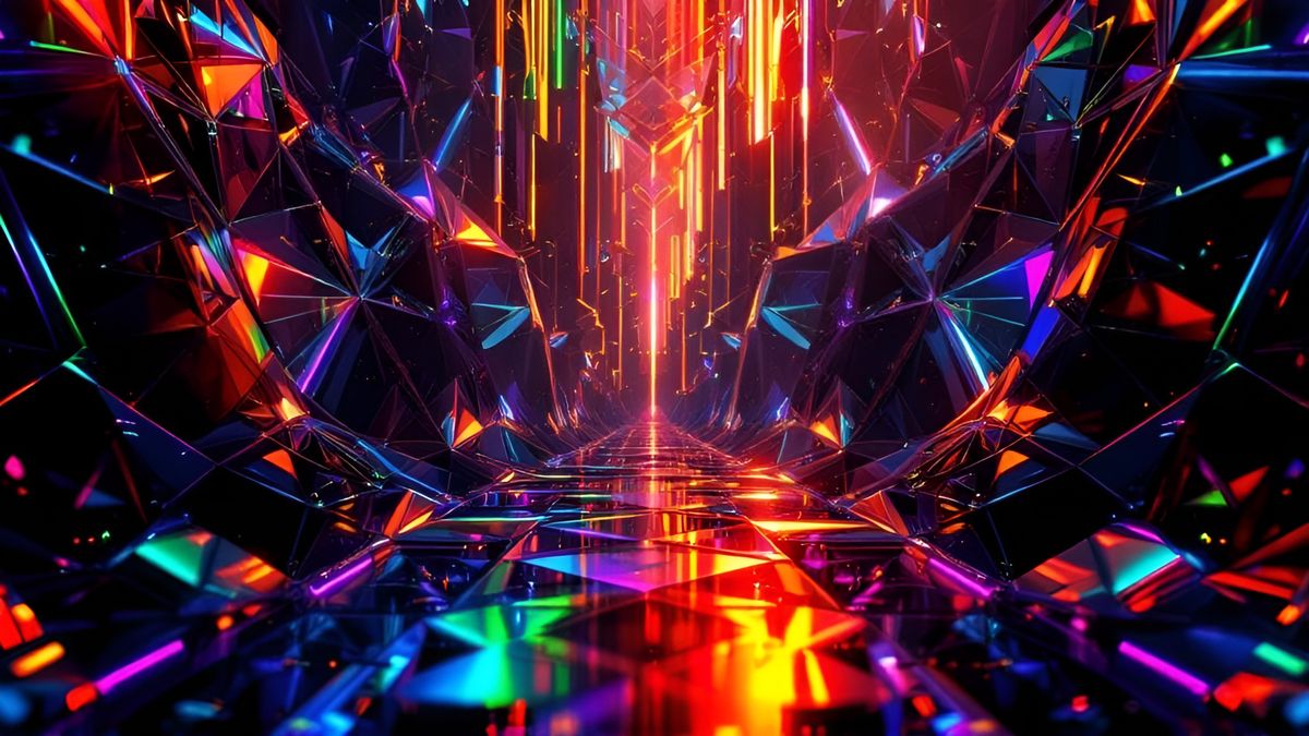 A striking picture of a rainbow bridge with polished metal light effects. The image features mathematical asymmetry, tessellations, and fractals, rendered with intricate details in a cinematic style.