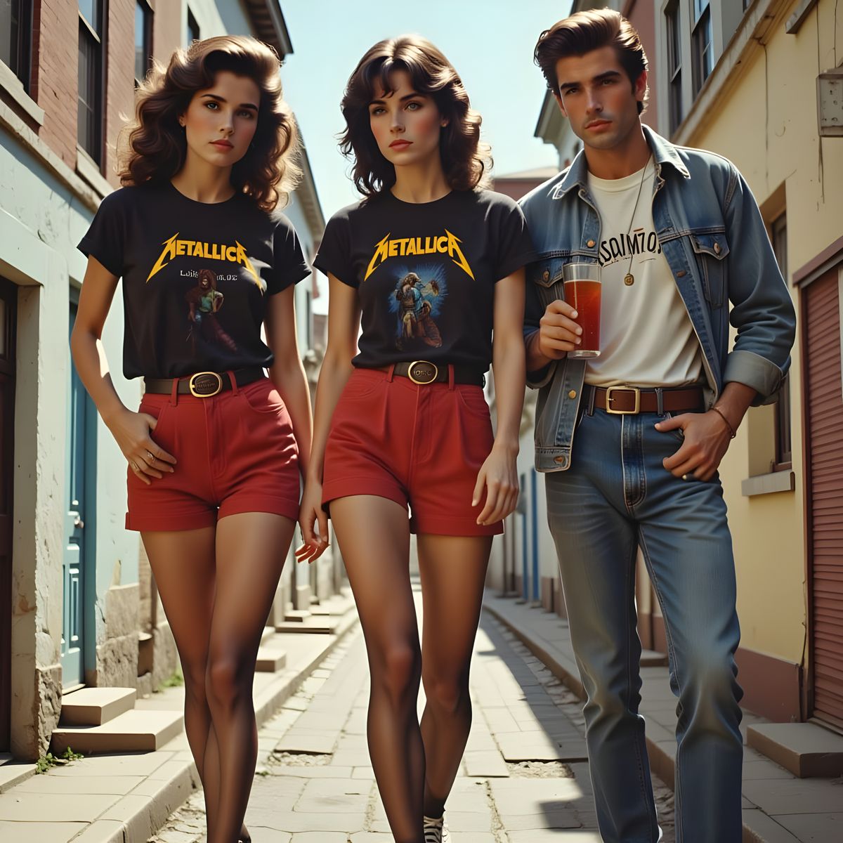 This image shows three young adults in a sunlit alleyway, dressed in 80s fashion and band t-shirts. The scene captures a moment of lively conversation and youthful energy.