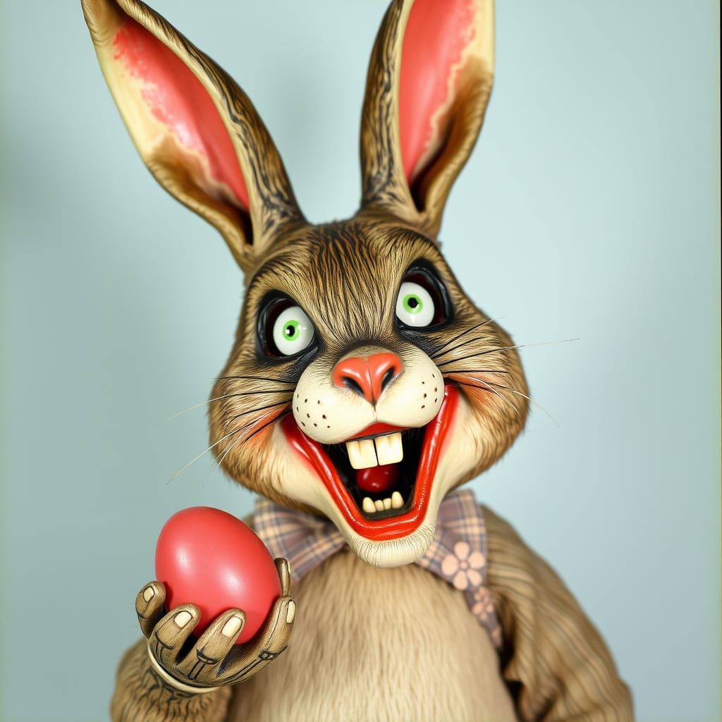 This image shows a haunting 1960s Easter Bunny with a darker twist, blending nostalgic and eerie elements.