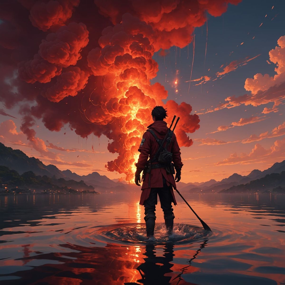 This image shows a dramatic scene of red fire in the sky and red smoke on the water. The artwork is rendered as detailed 3D anime art with an aesthetic and breathtaking quality.