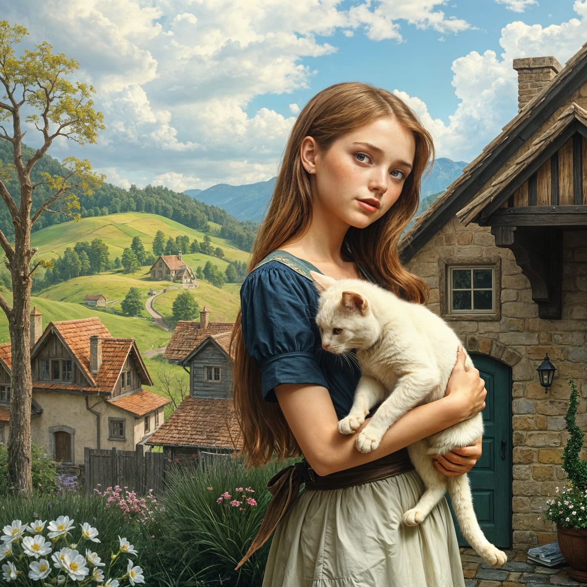 This image shows a beautiful fairytale scene of a freckled maiden holding a gorgeous white cat, set against a cluttered cottage backdrop in a serene spring valley.