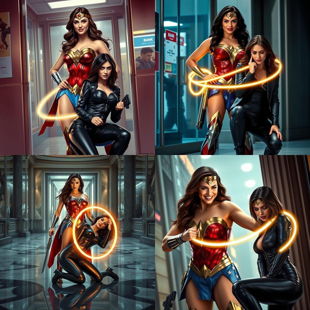 This image shows Wonder Woman thwarting a bank robbery with her Lasso of Truth. A captured spy in a black leather outfit looks shocked as the lasso coils around her.