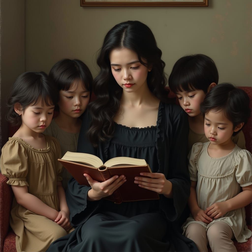 This hyper-realistic image shows a pale-skinned woman with wavy black hair reading to children in a quiet room, dressed elegantly in black.