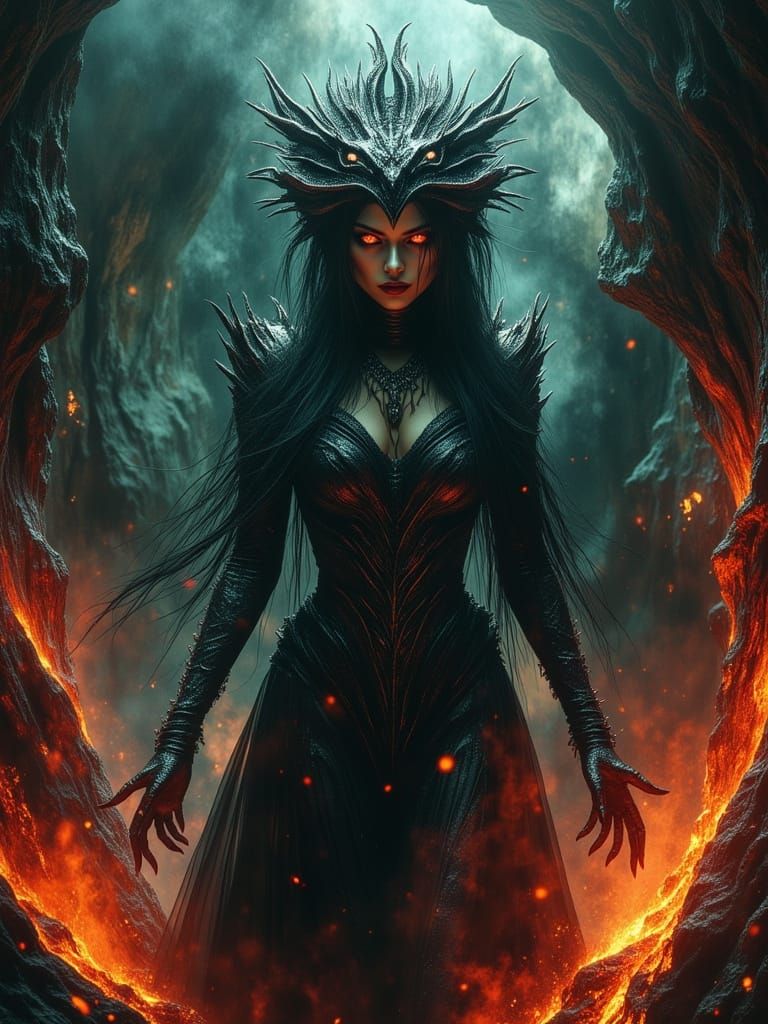 A powerful dragon woman with glowing red eyes and obsidian scales stands in a dark, volcanic cavern. Cinematic lighting and a fiery palette enhance the dark fantasy concept art style.