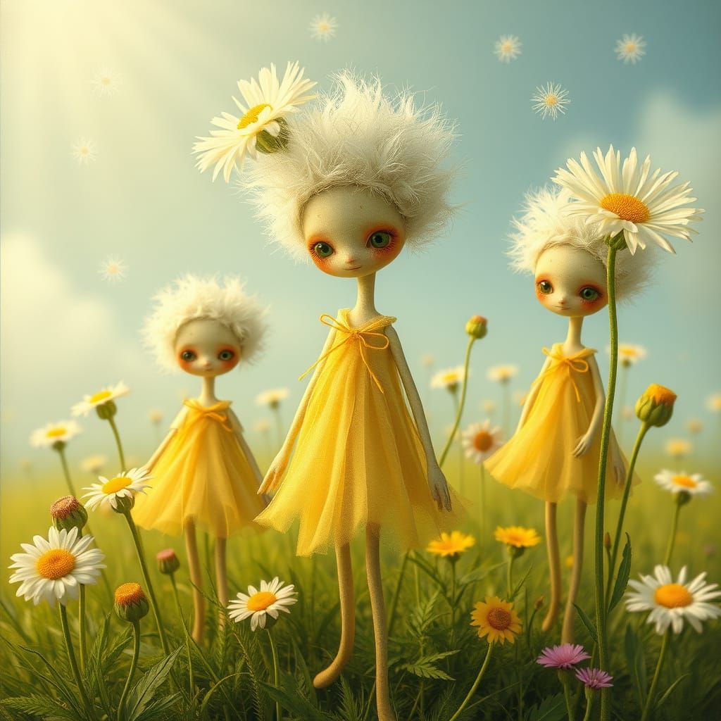 This image shows whimsical dandelion humanoids in a sunlit realm. The figures, with petal clothing and fluffy hair, are rendered in a fantastical art style.