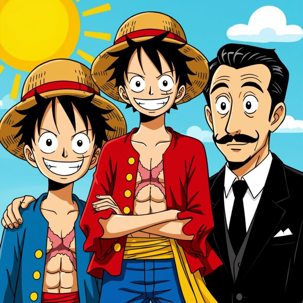This image shows a dog and a cat in a classic landscape setting. The artwork evokes the combined styles of Monkey D Luffy, Salvador Dali, and Hayao Miyazaki.