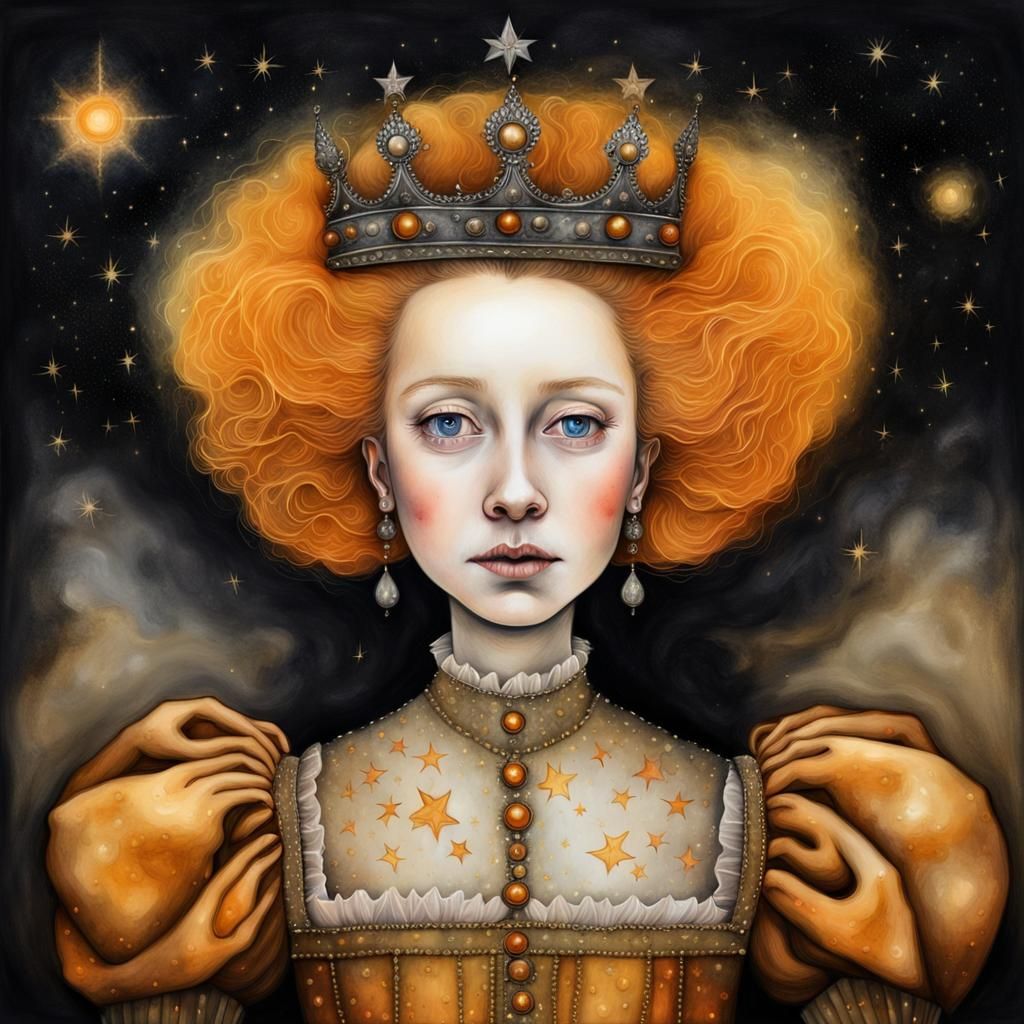 This image shows a surreal portrait of Queen Elizabeth I set against a dark night sky with stars. The artwork features a moody color palette with creams, yellows, and oranges, in a semi-transparent style.