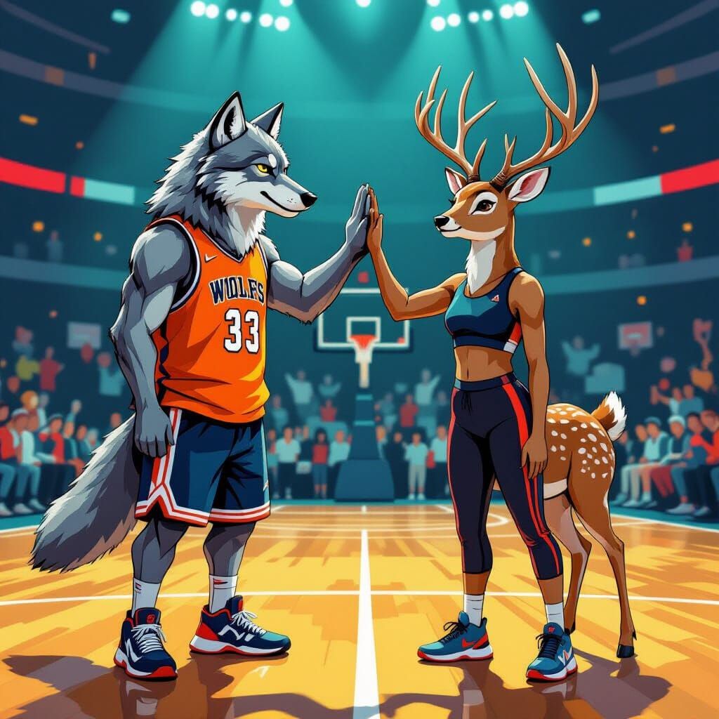 This vibrant image shows a wolf and a deer, dressed in basketball attire, high-fiving on a court. The artwork features bold lines and expressive textures in a dynamic style.