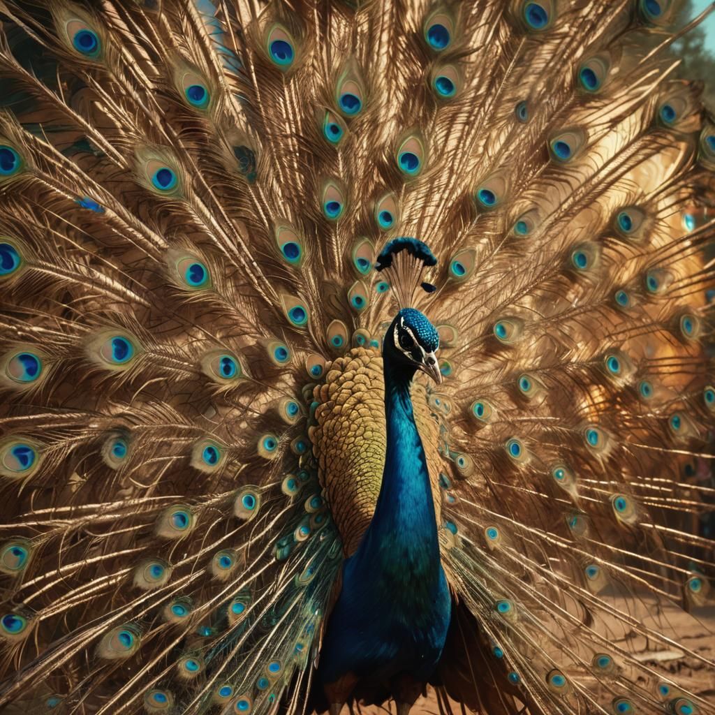 A striking picture of a peacock with plumage spread in the style of American Indian art. The image uses vibrant earth tones and bold lines, reminiscent of Native American pottery, with warm, dramatic lighting.
