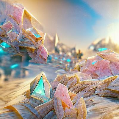 This image shows pastel colored crystals rendered with dynamic lighting and intricate details. The 3D render has a cinematic feel and is designed to resemble high-end videogame graphics.