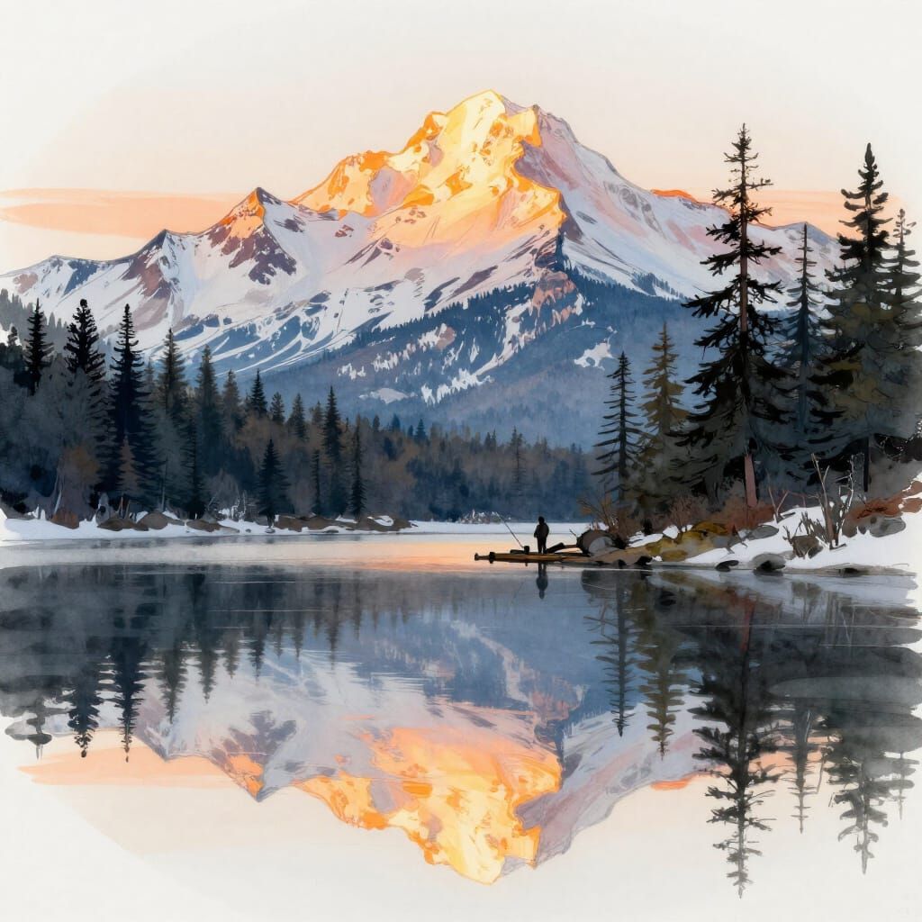 This image depicts a lone fisherman on a lake at sunset, with snowy mountains and forests reflected in the water, rendered in a sketch style.