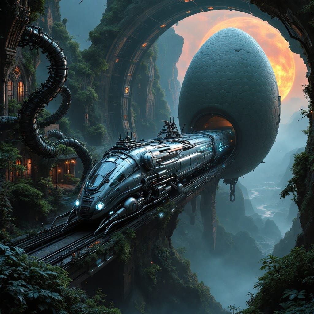 This image depicts a futuristic, ornate freight train-hybrid, blending industrial and organic textures, as it connects to a dark, ominous space-train station via a mechanical arm, set against a backdrop of intense lighting and deep shadows, evoking a sense of foreboding amidst a distant, fiery glow.
