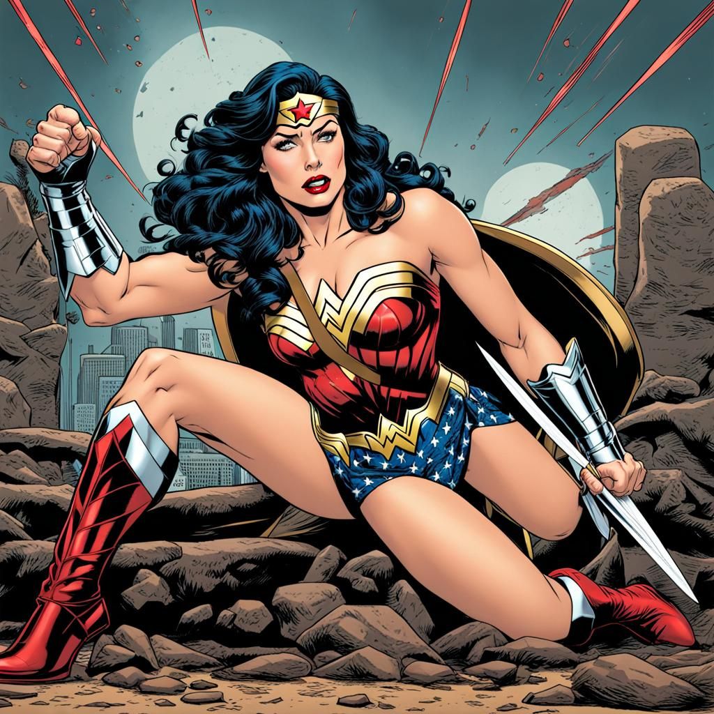 This image depicts Wonder Woman having knocked out an opponent. The illustration captures a powerful scene of victory.