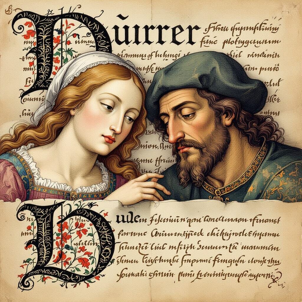 This image shows a medieval letter in high resolution, reminiscent of Dürer's style. A man and woman's faces lie on the letter, with large letters styled like animals.