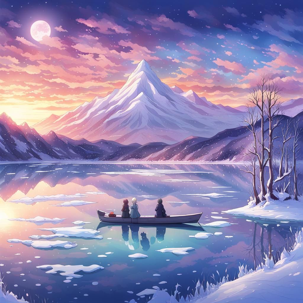 A vibrant image showcasing an iridescent lake reflecting a colorful sunset. The scene depicts a frozen landscape with ice and snow, rendered in a Japanese anime style.