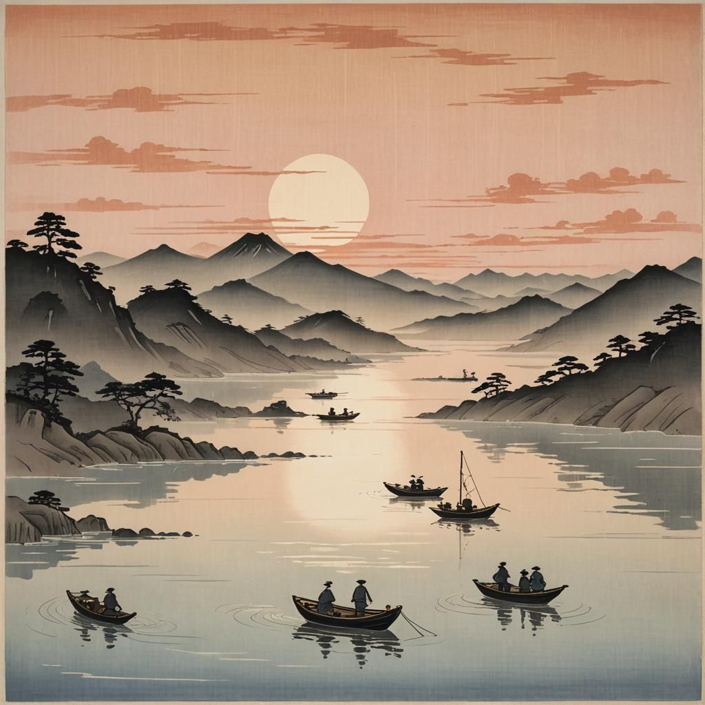 This image shows a serene Ukiyo-e style landscape of fishermen in a small boat on gentle waves at dawn. The soft focus and subtle colors create a peaceful, Japanese-inspired scene.