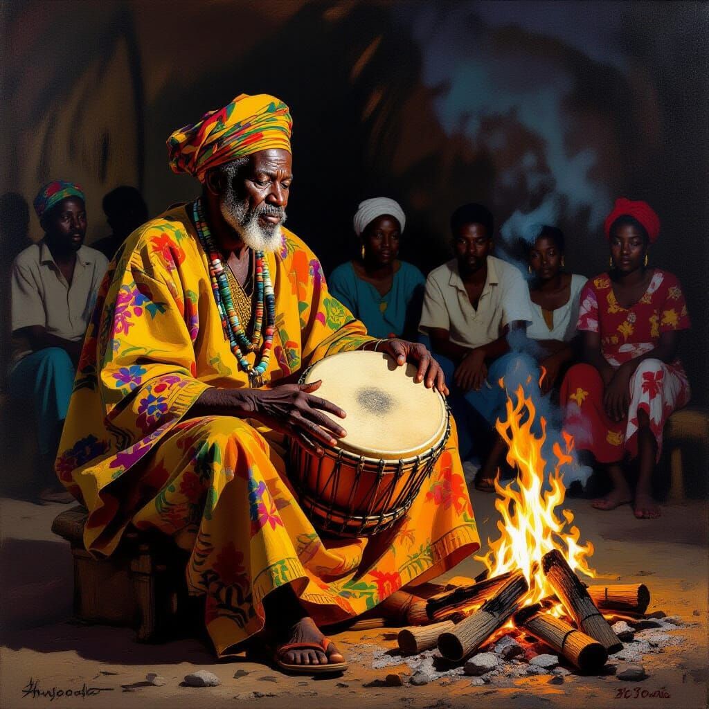 This image shows an elderly African griot in a colorful boubou, holding a drum by a fire. Dramatic shadows and rich colors evoke a spiritual, storytelling atmosphere in a realistic painting style.