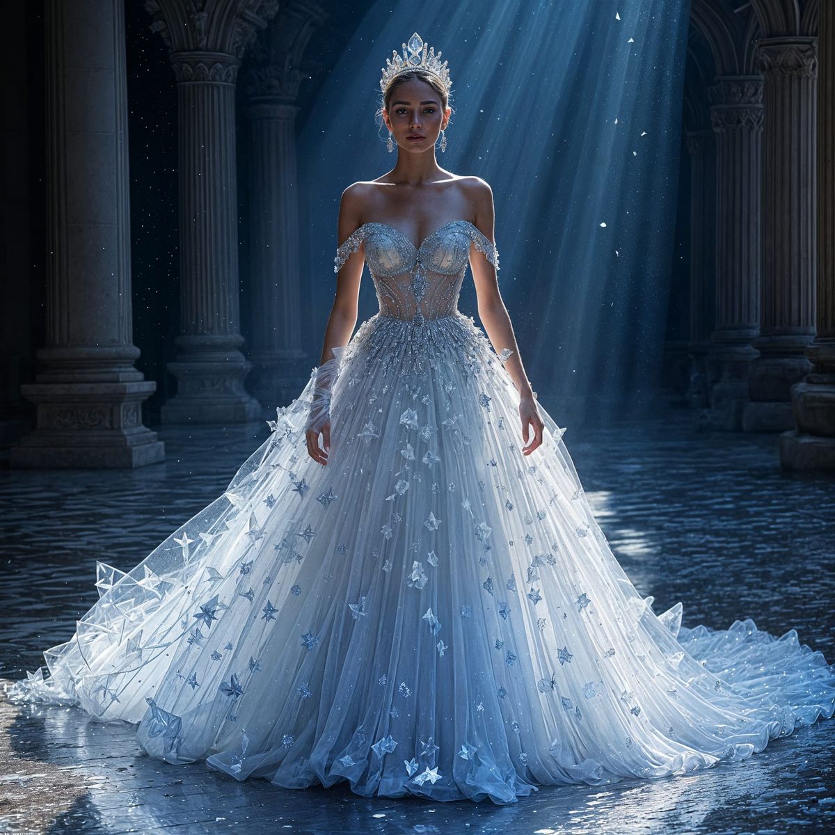 This image shows a celestial queen adorned in a breathtaking gown. The gown is made of cascading crystal shards and delicate glass petals, creating a stunning visual effect.