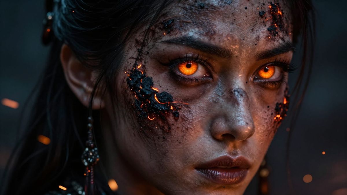 A hyper-detailed, ultra-realistic portrait of a warrior woman with embers on her face. Deep, dramatic lighting and a dark, moody atmosphere create an epic movie poster feel.