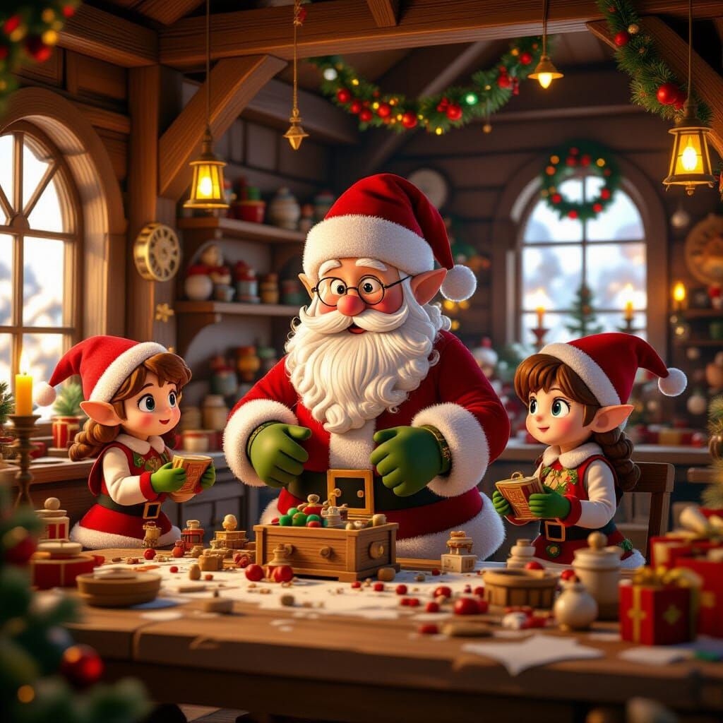 This image captures Santa's festive workshop with elves crafting wooden toys by candlelight. Rendered in a detailed 3D anime art style, it evokes a cozy Christmas atmosphere.