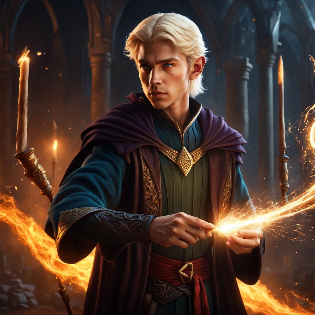 This image shows a very young half-elf wizard with blonde hair in a low ponytail casting a spell with a wand. It is a detailed matte painting with deep, complementary colors.