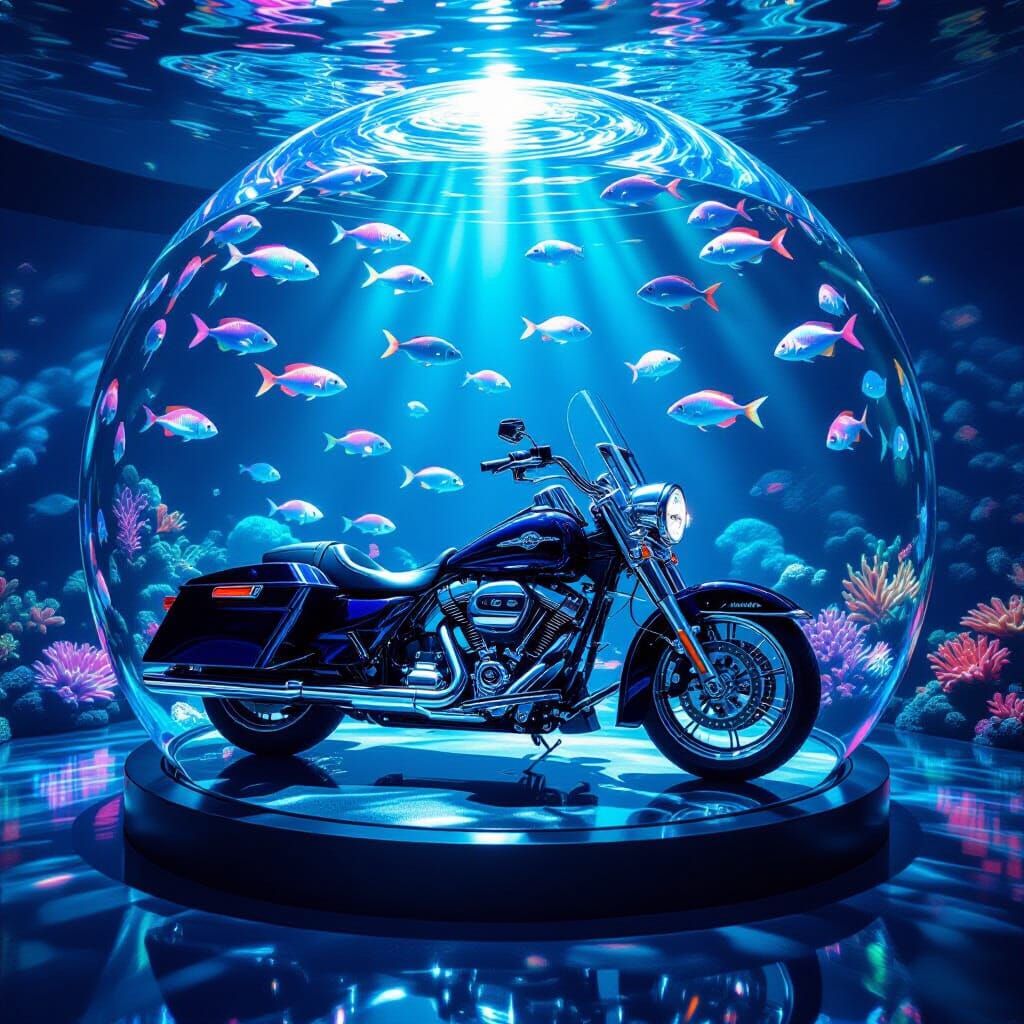 This image shows a hyperrealistic digital matte painting of a 2025 Harley motorcycle in a round fish tank. Tropical fish swim around the vehicle, illuminated by bioluminescent coral, creating a surreal, vibrant scene with dynamic lighting.