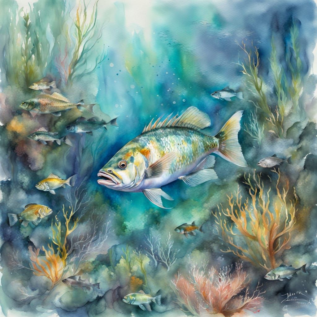 A hyperdetailed watercolour of a Barramundi fish in an Australian underwater environment. The artwork uses a pastel colour palette to create a harmonic and intricate fantasy atmosphere.