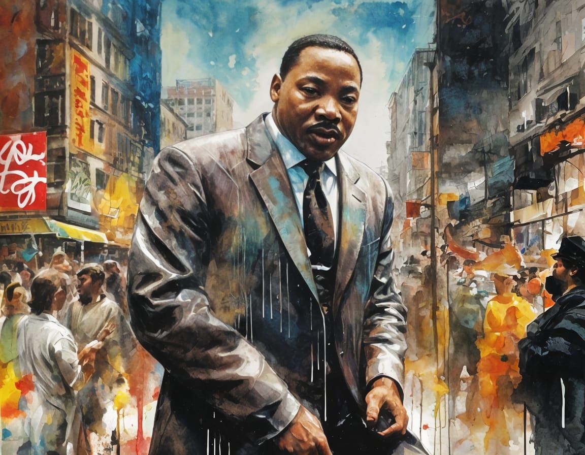 This image features a detailed, expressive portrait of Martin Luther King, Jr. rendered in a stencil graffiti style with a colorful ink and watercolor wash background.