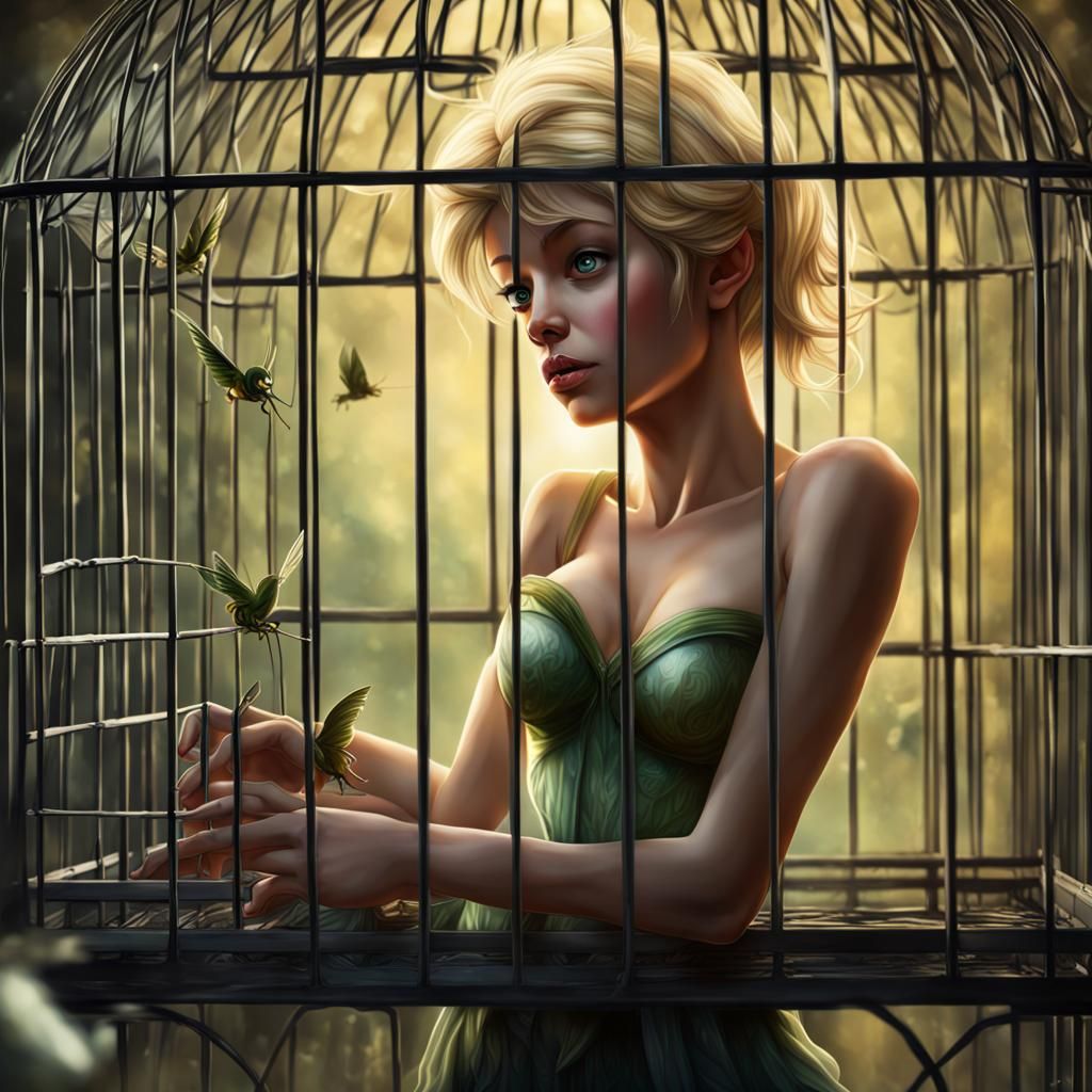 A hyperrealistic digital painting of Tinkerbell trapped inside a birdcage. The dramatic lighting and detailed rendering capture her fear and desperation in this concept art piece.