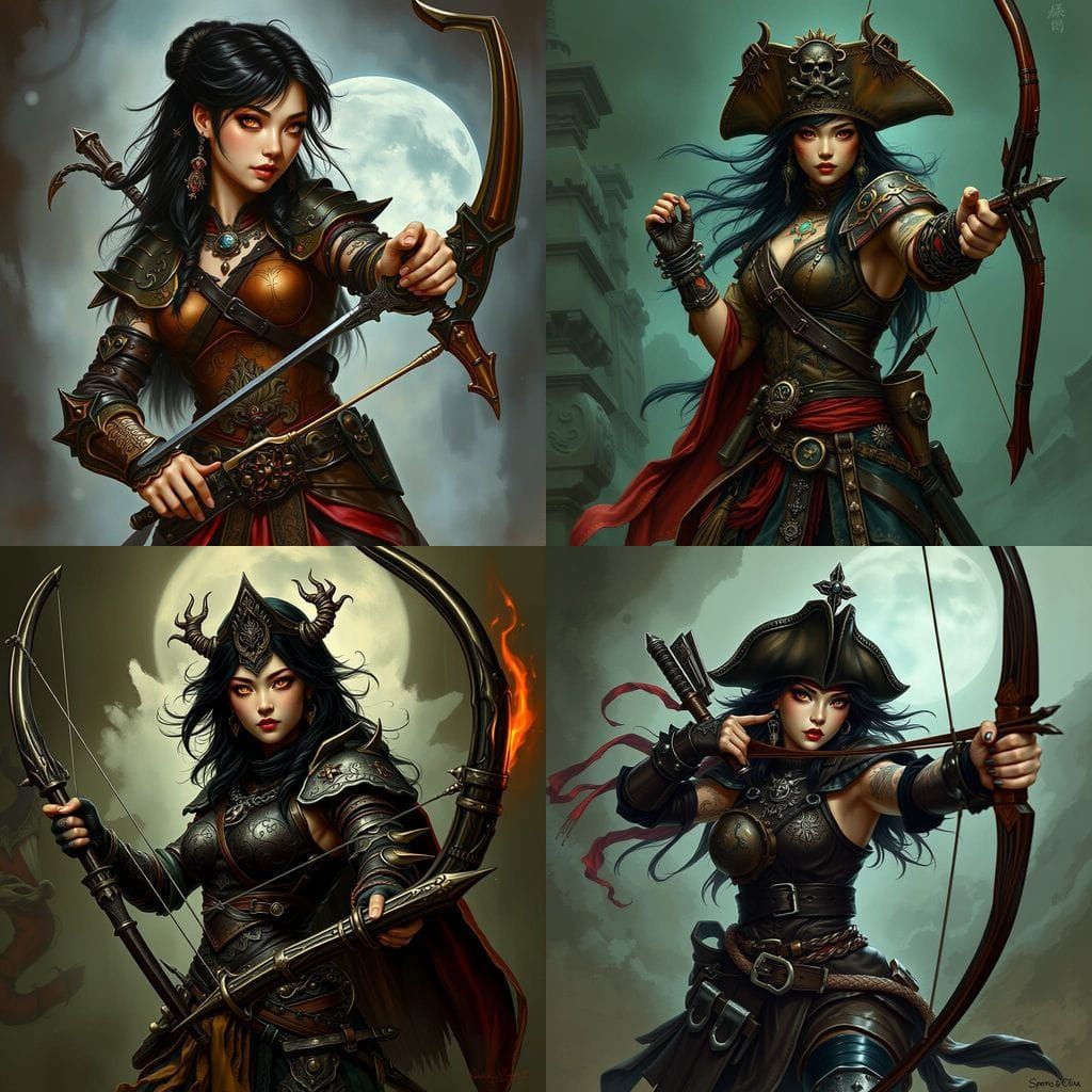 A striking picture of an Asian pirate woman in leather armor, wielding a whip, rapier, and long bow. She has glowing eyes and eldritch tattoos in a dungeons and dragons setting.