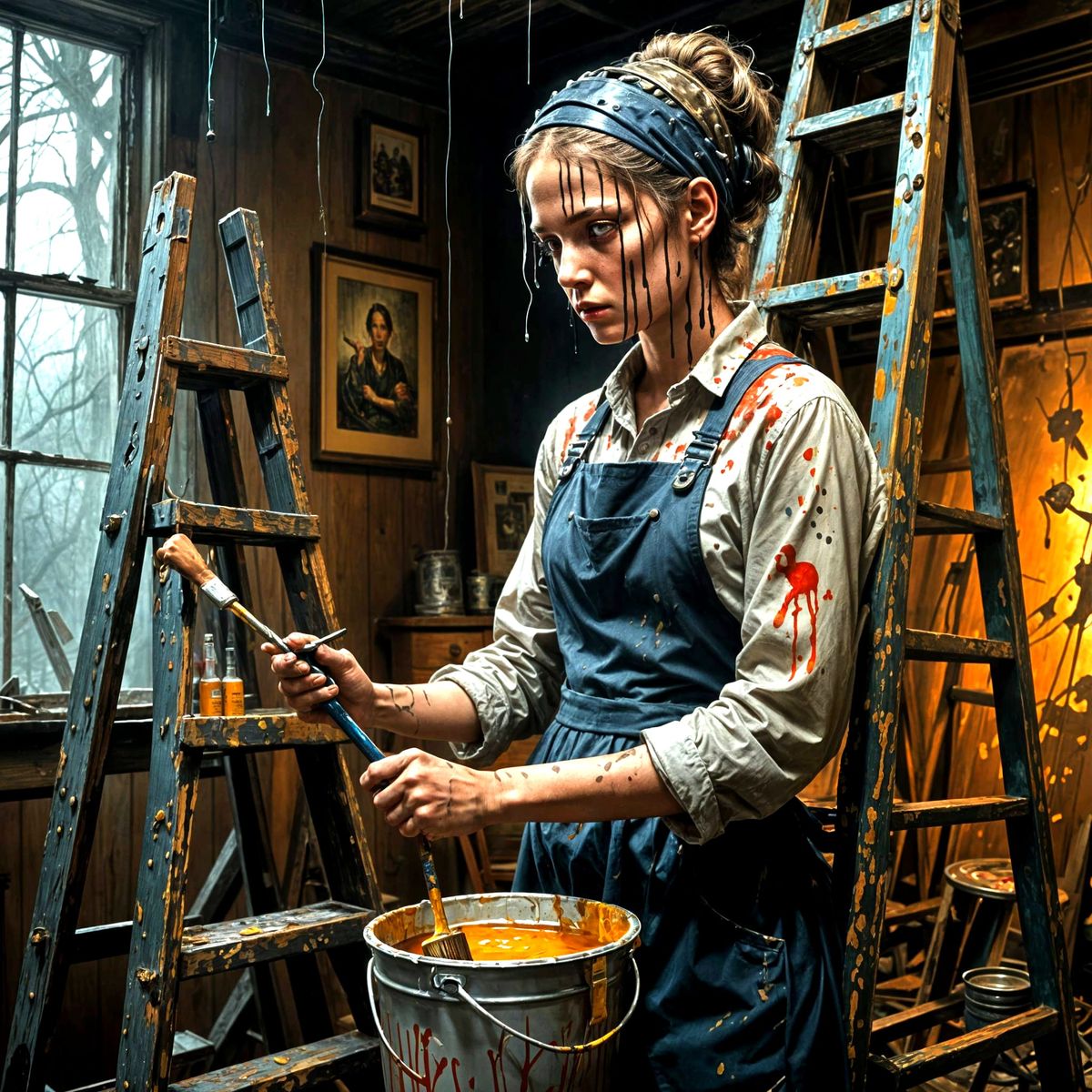 This image depicts a young girl surrounded by paint, with a sinister atmosphere reminiscent of dark, mystical landscapes. The use of bright colors and a blend of realistic and dreamlike elements evoke a sense of unease and wonder.