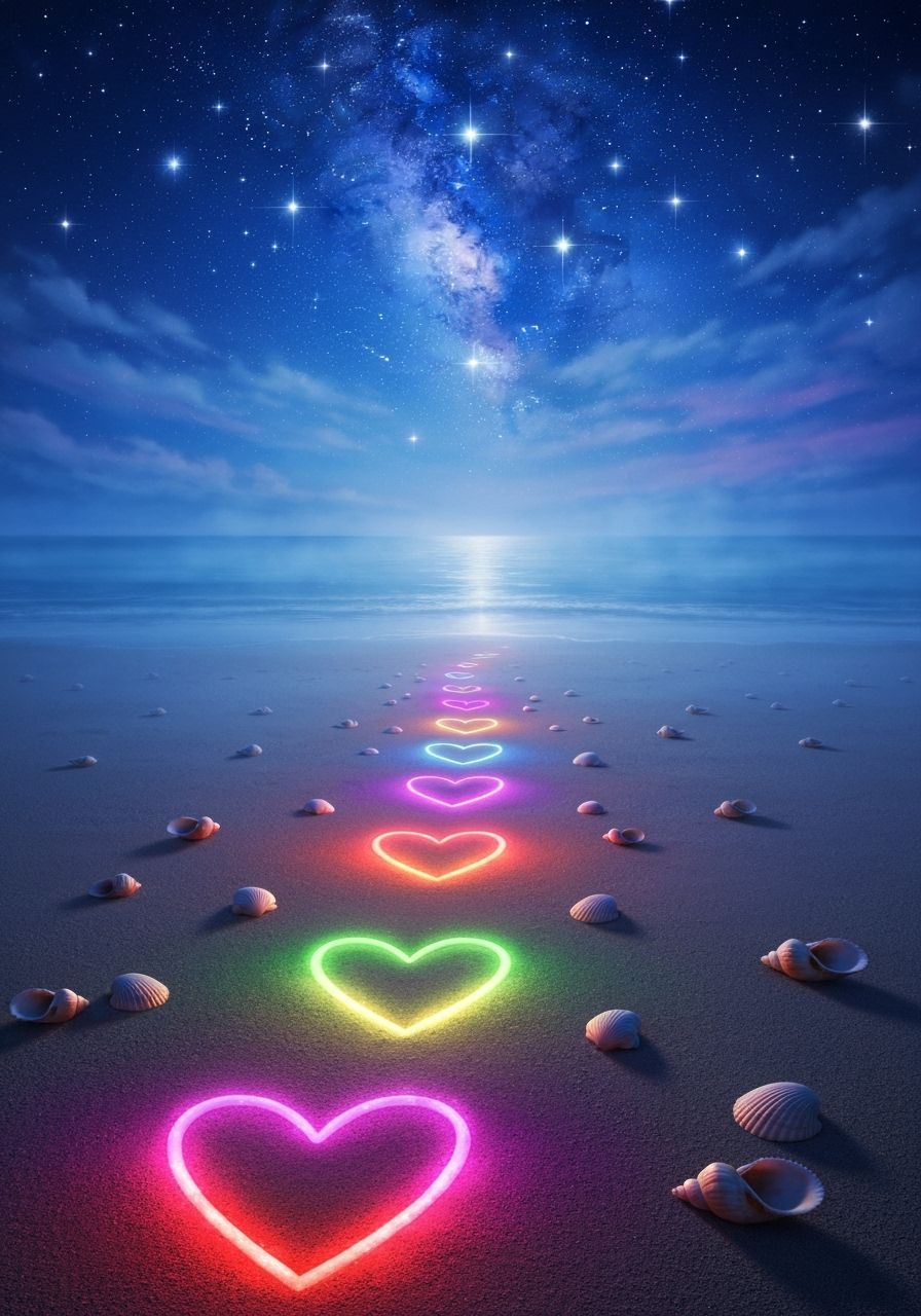 This image shows a digital painting of a glowing heart pathway to the sea. The vibrant path illuminates seashells on a sandy beach under a twilight sky, creating a magical atmosphere in graffiti art style.