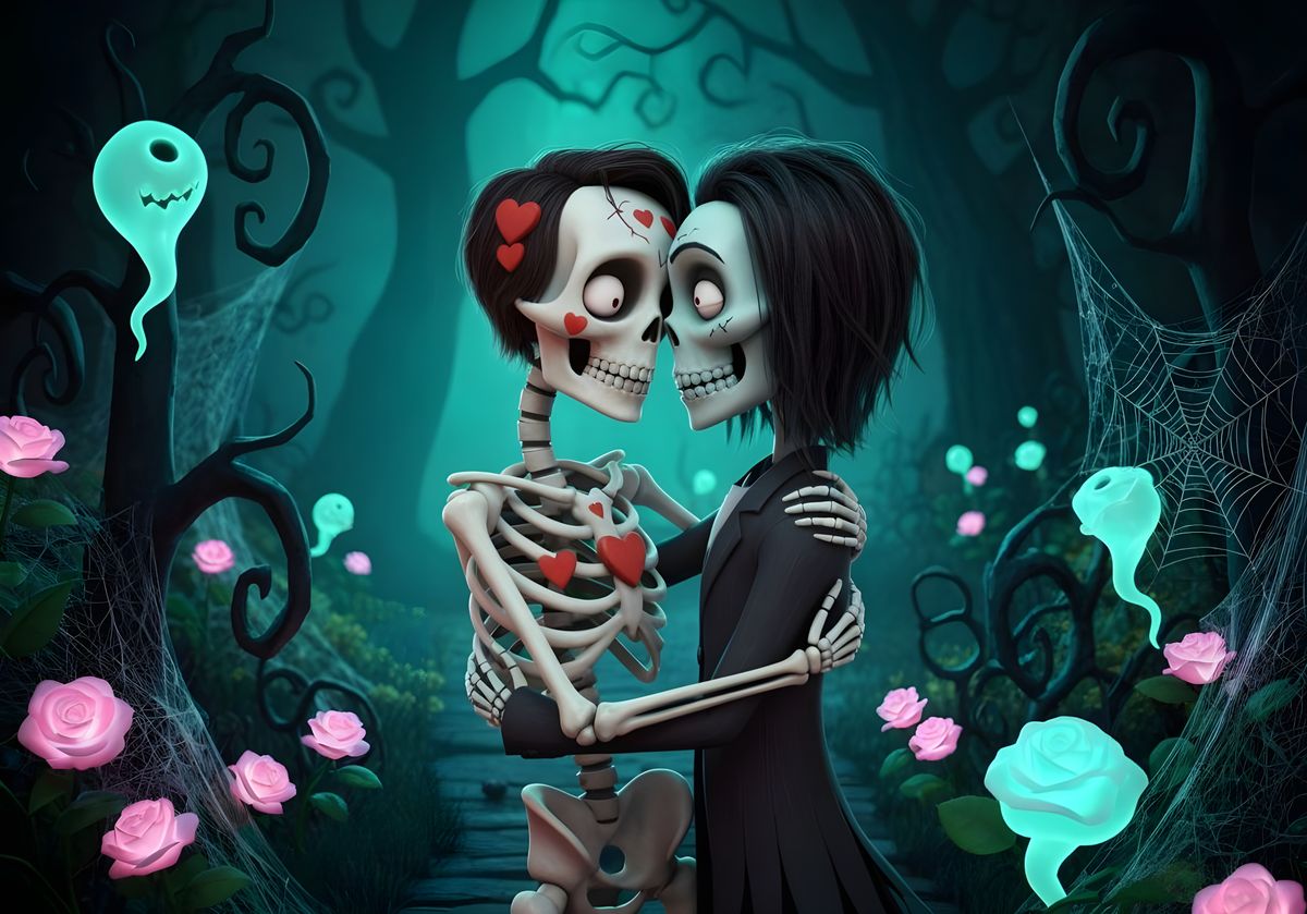 This image shows two stylized CGI Halloween characters, a skeleton and a ghoul, embracing in a haunted garden. The scene features ghostly roses and spiderwebs, illuminated with dramatic, moody lighting, capturing a spooky romance.