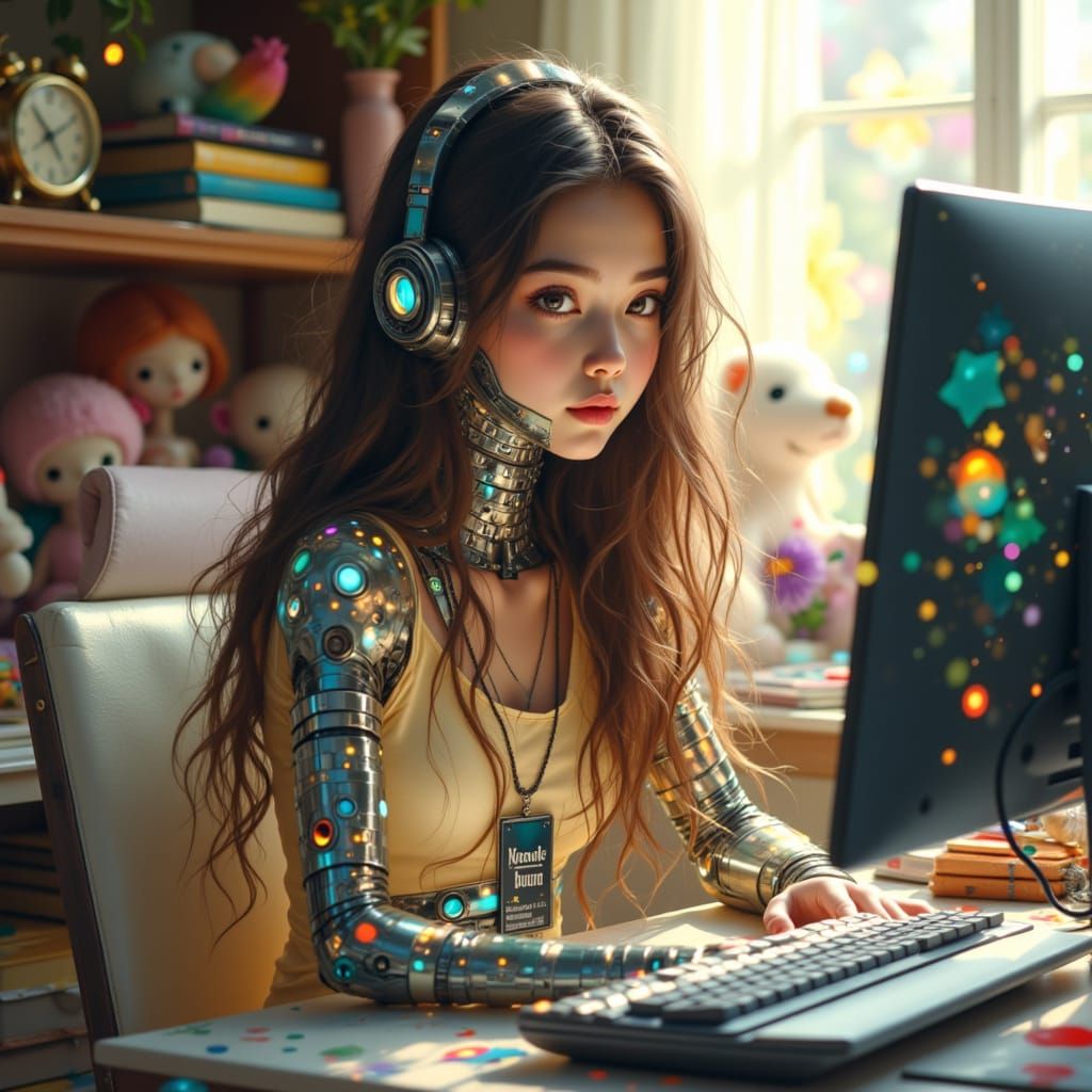 This image shows a young cyborg girl with a mechanical arm at her computer. She is surrounded by toys in her bedroom in this dreamy image with a touch of humor.