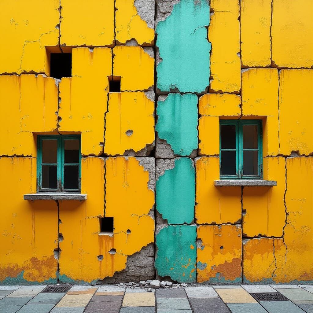 This image shows a surreal mural on a textured wall featuring bright yellow and turquoise. The wall has cracked plaster, chipped paint, geometric panels, rustic windows, and tiny openings in a dystopian style.