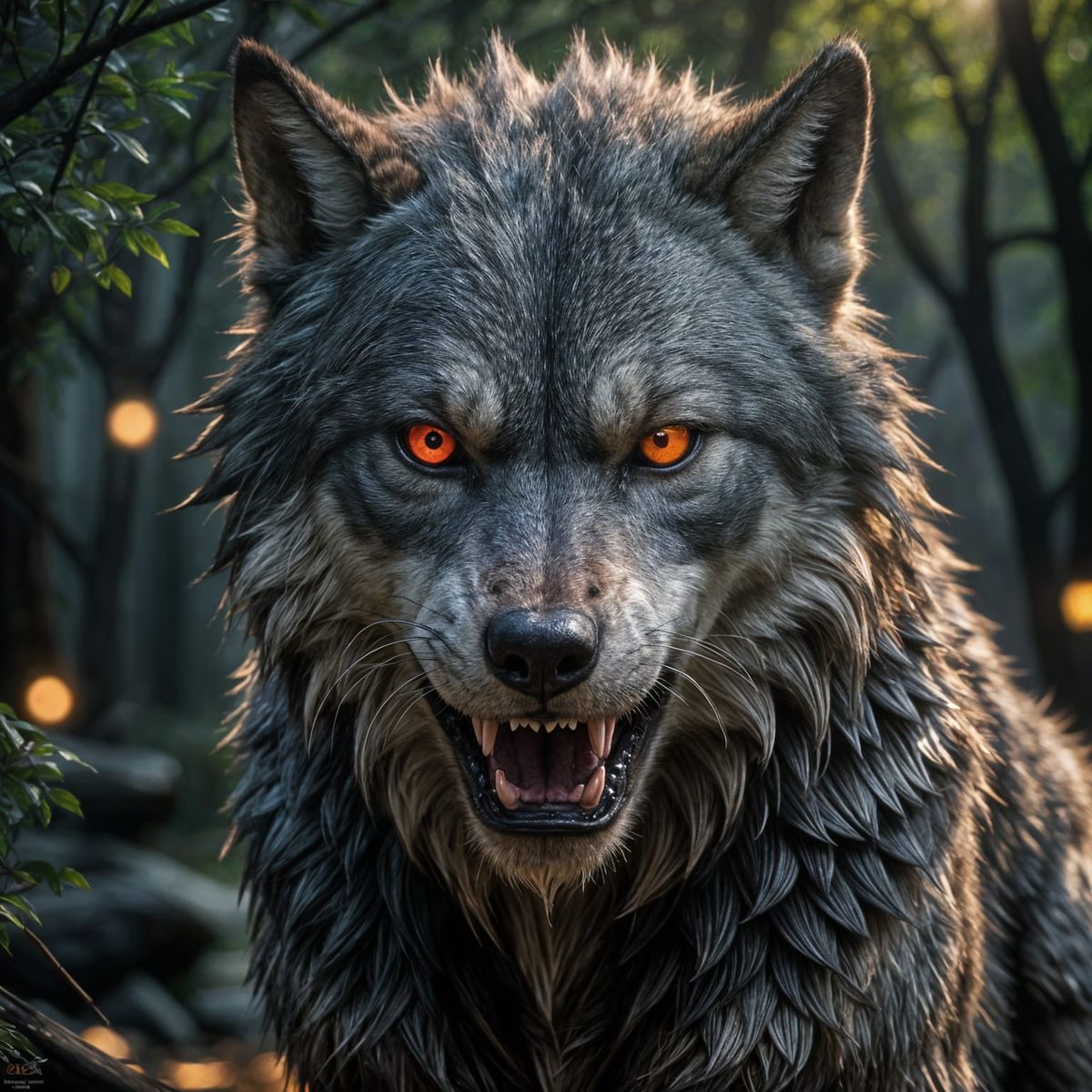 This cinematic film still captures a close-up of a wolf's snarling face with red glowing eyes, set against a detailed dark background, creating a dramatic and atmospheric scene reminiscent of a 35mm film.