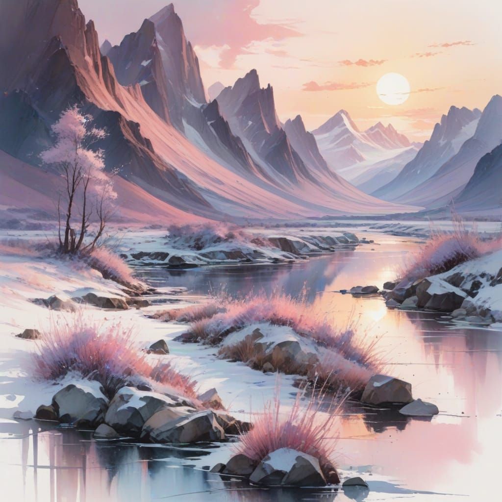 A breathtaking view of glaciers in Patagonia, Chile, illuminated by the soft hues of sunset. This neo-impressionist image captures the scene with thick brushstrokes and luminous color grading.