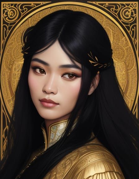 A close-up portrait of a young Malay woman with long black hair and violet highlights, wearing a black dress with gold trim in the style of Art Nouveau. The image is softly focused, with golden light and a smoky backdrop.