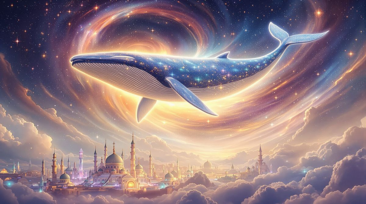 A striking picture of a massive sky-whale floating through a colorful nebula. Below, a futuristic city shines with crystal buildings. The artwork features luminous colors and a fantastical atmosphere reminiscent of Parrish, as well as intricate detail similar to Moebius.