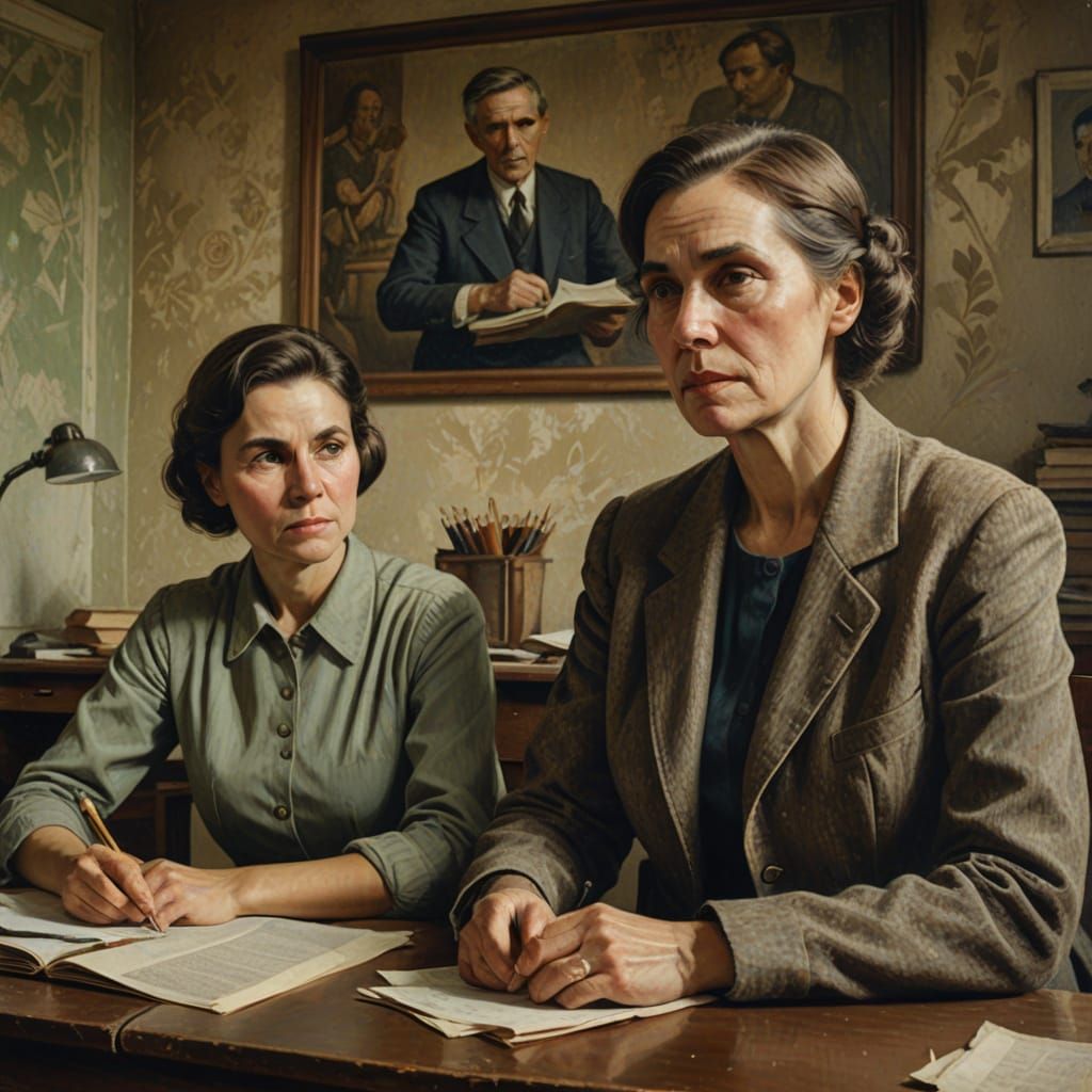 This oil painting in muted earth tones depicts a teacher in a vintage, low-key classroom. The realistic style features gritty texture and high contrast, evoking a distressed, cinematic feel.