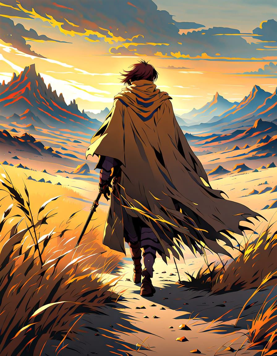 This image depicts a lone traveler in wind-swept dead grasslands, rendered in a vibrant anime illustration style. Ominous mountains loom in the distance under golden hour light.