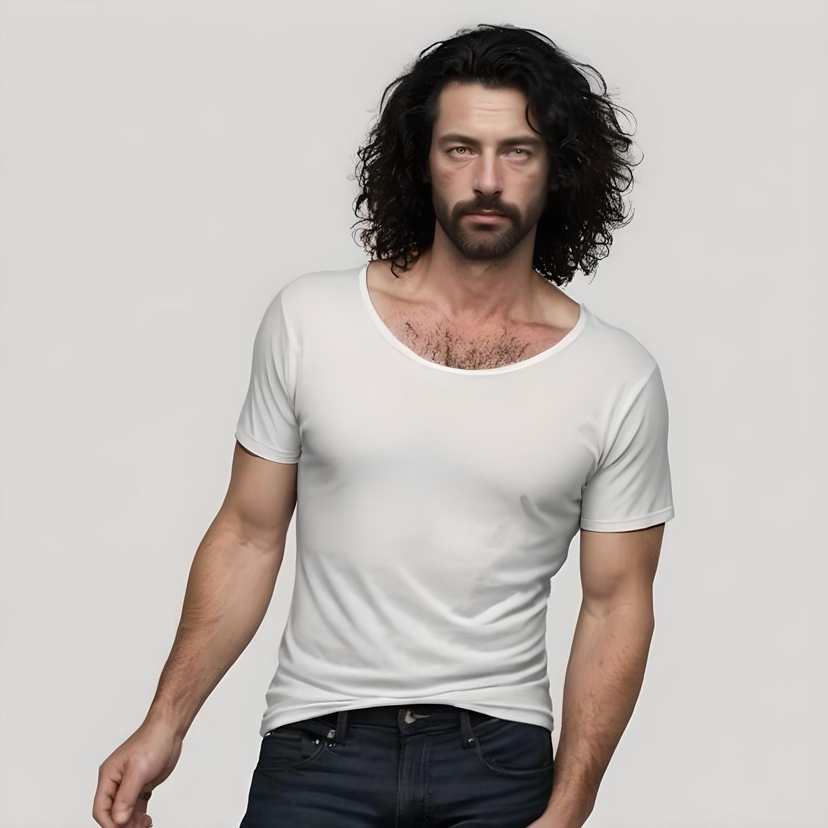 A full body portrait of a shy, middle-aged Cajun man with shoulder-length curly black hair and bright green eyes against a white background. The image shows a man with freckles and short facial hair.