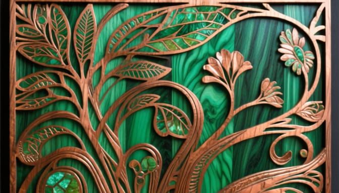 This image showcases a biophilic artwork blending jade, copper, and wood in an art nouveau style. The relief sculpture emphasizes natural forms and intricate details.