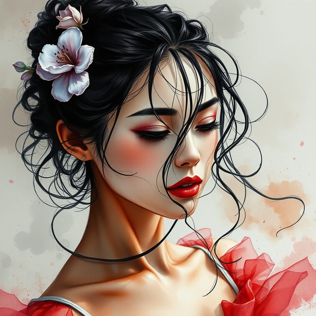 A striking portrait of a focused ballerina, her dreams woven around her. Rendered with charcoal and watercolor wash, featuring alcohol ink accents for a moody, cinematic feel. Captures ultrafine detail and high contrast.