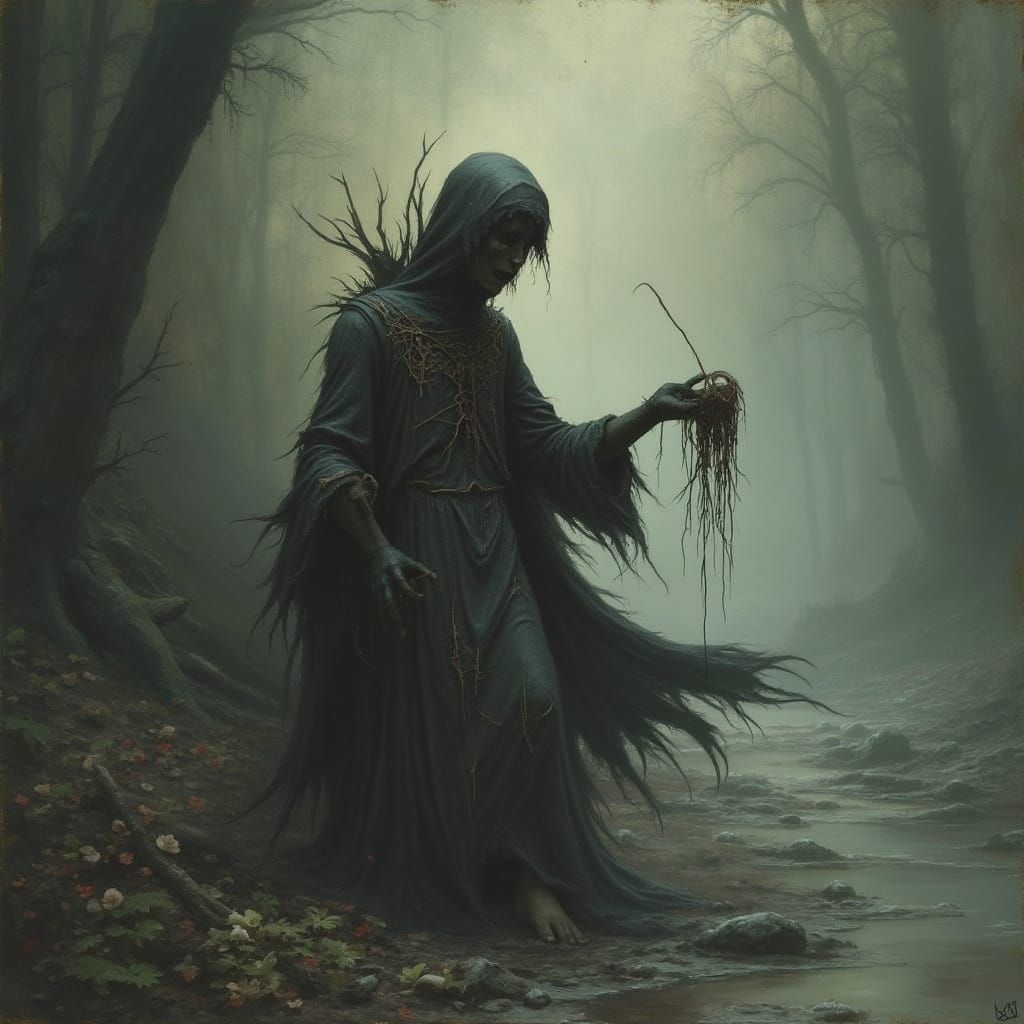 This image shows a haunting figure in dark clothing standing in an abandoned landscape. The image is reminiscent of an old, decaying illustration with faded colors, in a horror art style.
