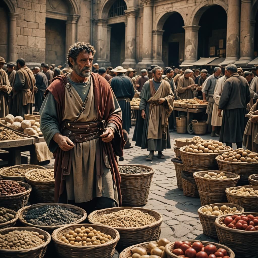 This image depicts an ancient Roman man trading goods at a bustling market. The scene is reminiscent of a cinematic film still, complete with film grain and dramatic, atmospheric lighting.