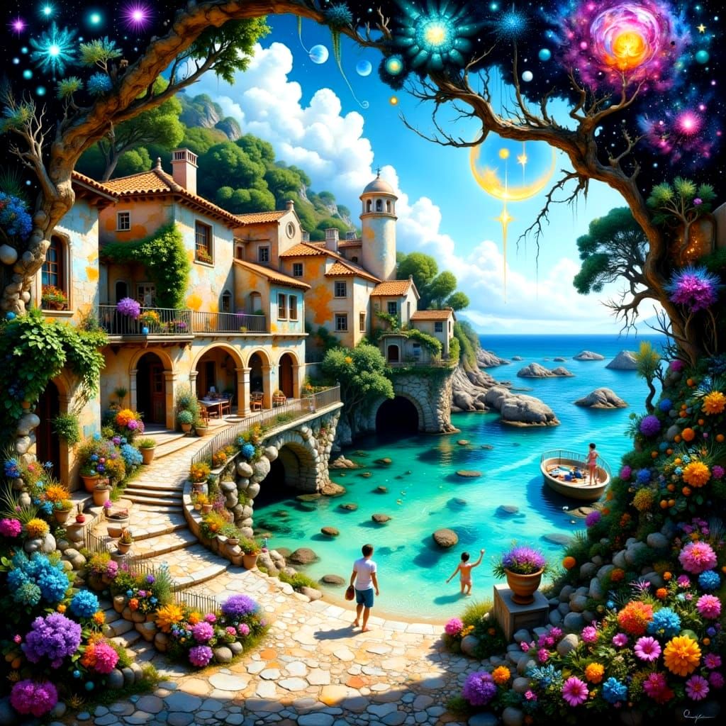 This image captures a charming seaside village with weathered stone houses, cobble streets, and a stunning sea view, set amidst lush greenery and vibrant flowers, rendered in a whimsical, hyperdetailed style