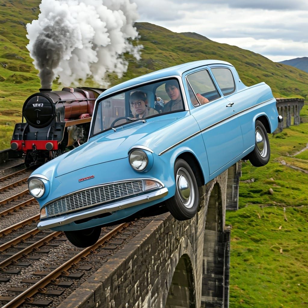 A realistic image of a powder blue Ford Anglia flying over the Glenfinnan Viaduct. Ron Weasley drives, with Harry Potter as his passenger, as a red steam train passes below.