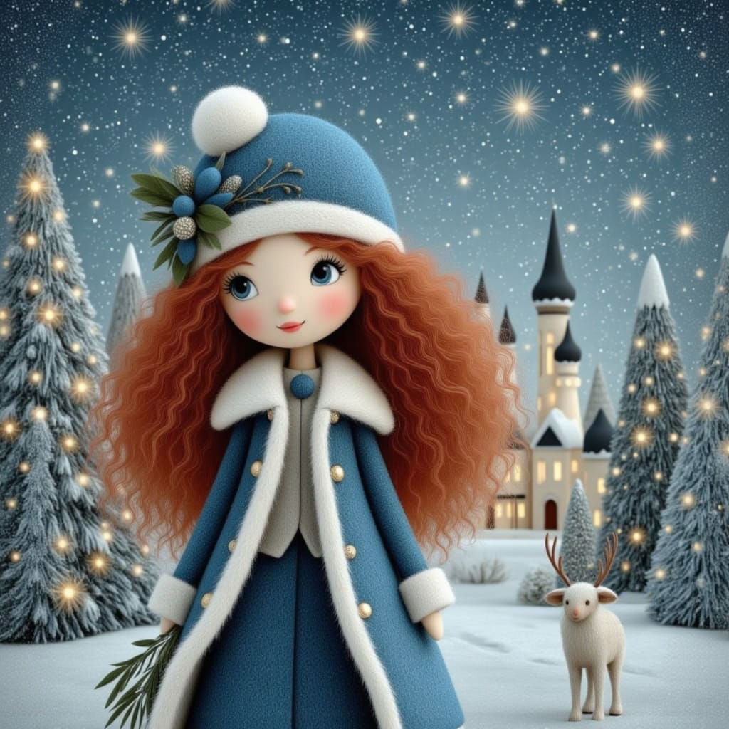 "<lora:WOOLEN WORLD FLUX:1.0> <lora:Les poupees de Julia:1.0> A beautiful village, snow flakes, bright shining star lights on the houses and pine trees. A beautiful woman , with red curly hair, blue eyes and pink smiling mouth is dressed in bright blue coat with white fur collar .and hat that matches coat carrying mistletoe and surrounded by shining snow flakes, Surreal winter scene"